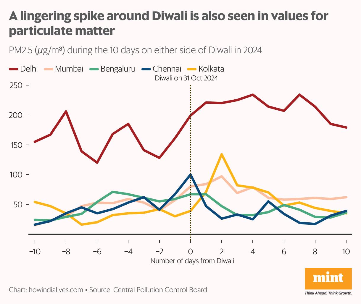 This year was no different, as air pollution levels surged. The after-effects are likely to persist, as pollutants remain in the air and dissipate slowly. The bigger problem for Delhi, in fact, a large swathe of North India, is that pollution spikes after Diwali and persists through the winter months.