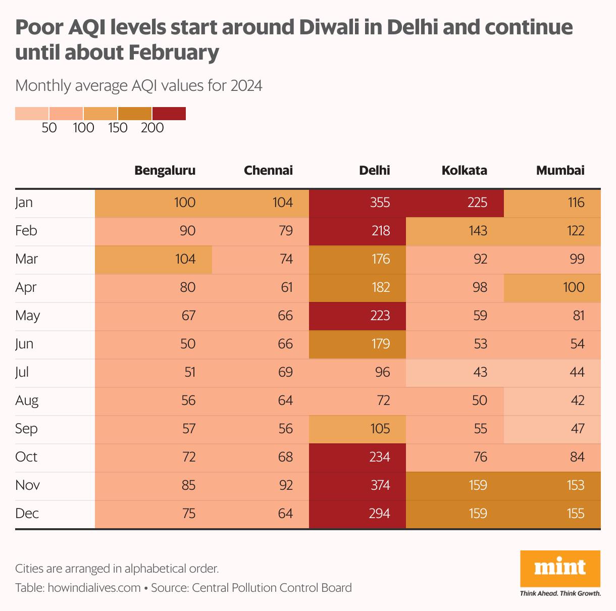 Also Read | Why do we remain in the dark about the harmful effects of light polluti Hanging in the airIf data for 2024 is anything to go by, the toxic air is likely to linger in the aftermath of the Diwali burst, not just in Delhi NCR but also in other leading Indian cities. The air quality index (AQI) is a single value intended to show a composite picture of air quality across multiple pollutants.