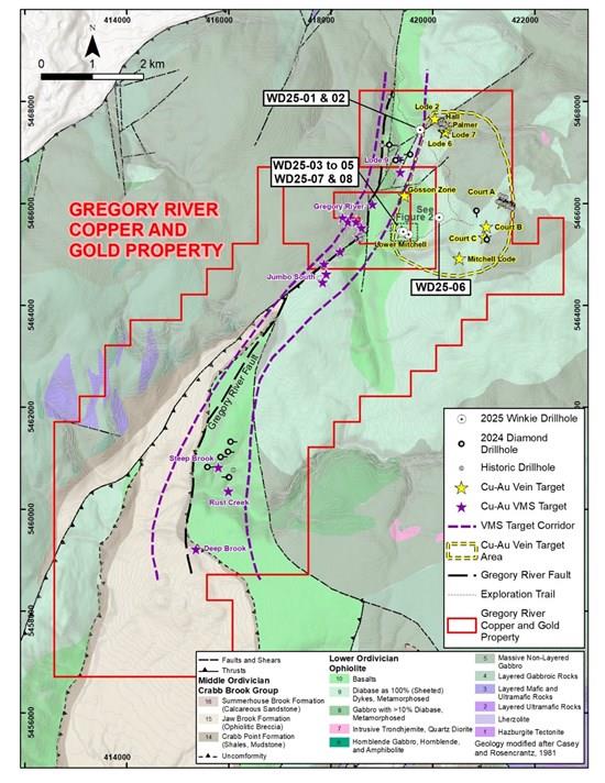 Drilling was completed by Majors Contracting Ltd., based in Deer Lake, Newfoundland and took place from July 9 to August 2, 2025, using a UTV-mounted Winkie drill rig producing AQ diameter core (27 mm). Drill holes were collared at -45° and drilled in various directions to drilled depths ranging between 34 m and 63 m. All drill holes had excellent core recovery, averaging greater than 95% recovery. Table 3 summarizes the drill hole details and Figures 1 and 2 show the locations of the drill holes.