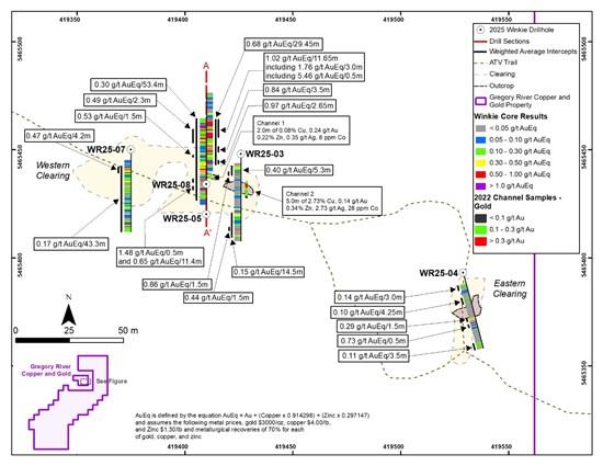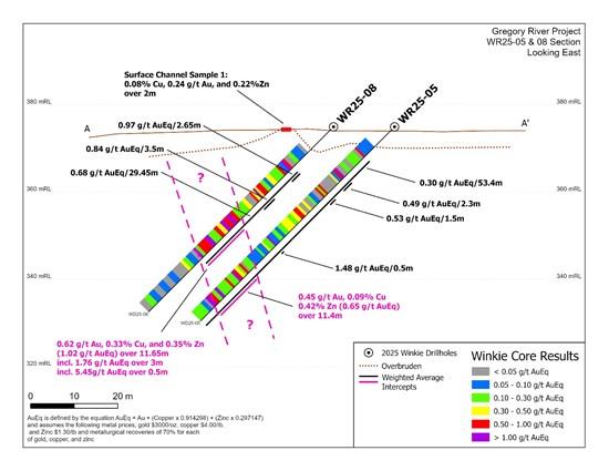 There is an Insufficient amount of drilling to determine the true widths of the mineralization reported in the table; AuEq is defined by the equation AuEq =Au +(copper x 0.914298) + (zinc x 0.297147) and assumes the following metal prices, gold $3,000/oz, copper $4.00/lb, and zinc $1.30/lb and metallurgical recoveries of 70% for each of gold, copper, and zinc. No metallurgical testwork has been completed for mineralization at Lower Mitchell, and it is still considered a very early-stage prospect, however based on a review of other similar projects it is assumed that the elements included in the metal equivalent calculation have a reasonable prospect to be economically recovered.
