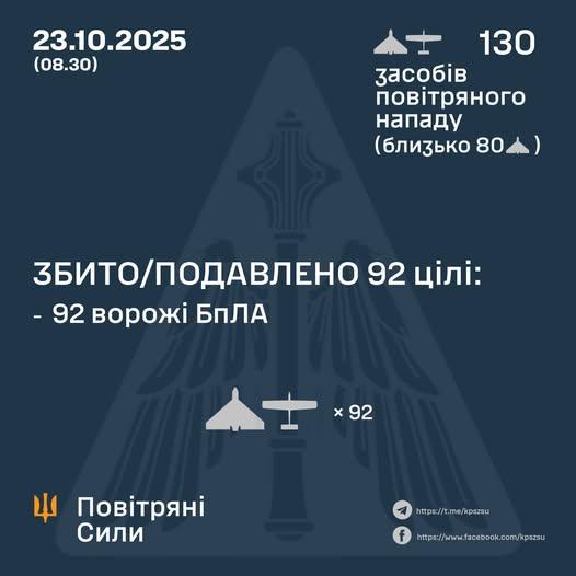 According to preliminary data, as of 08:30, Air Defense Forces shot down or jammed 92 enemy Shahed and Gerbera UAVs and other types of drones in the north and east of the country.