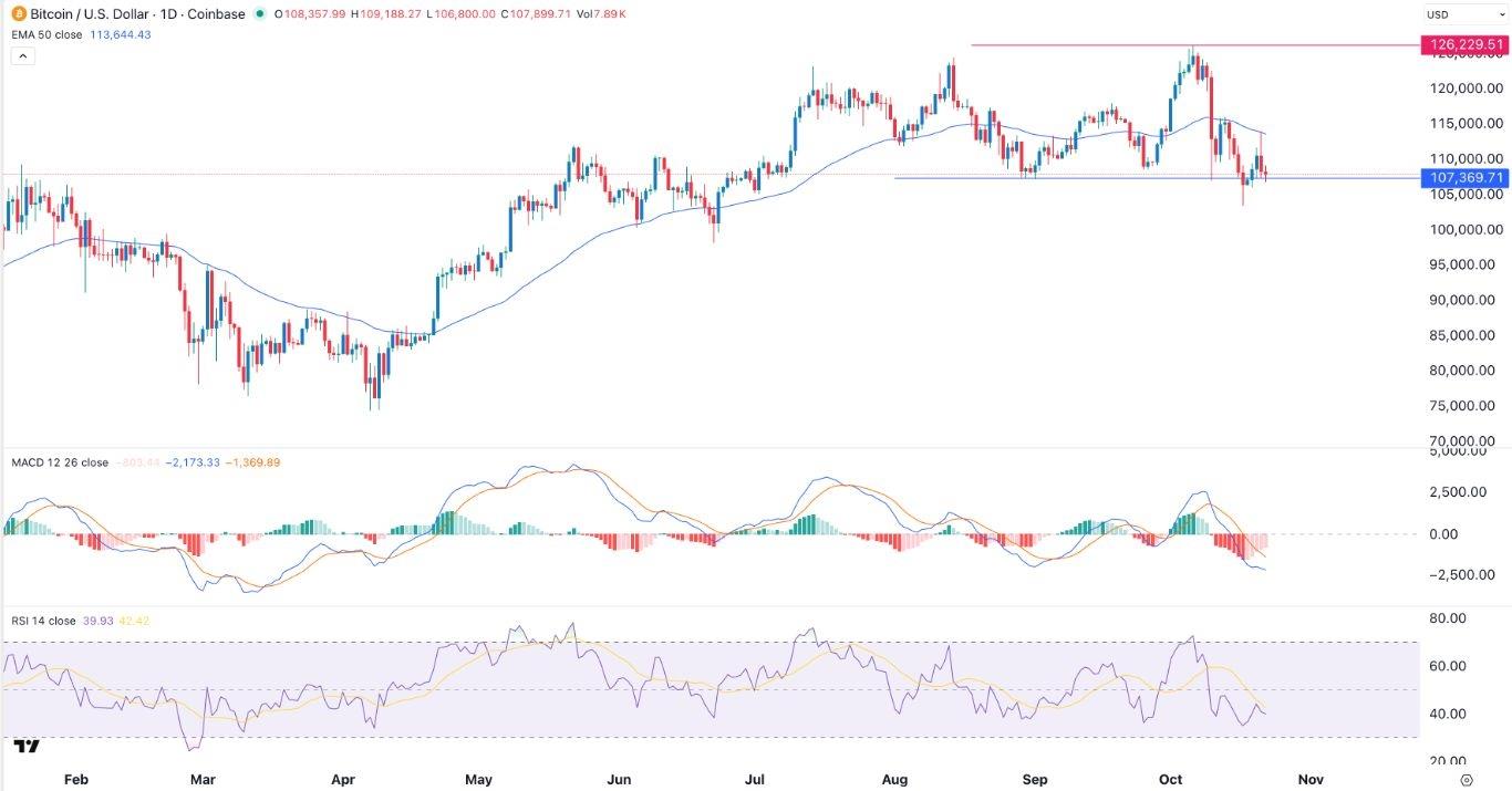EURUSD Chart by TradingViewBTC/USD Technical AnalysisThe daily timeframe chart shows that the BTC/USD pair has slumped after hitting its all-time high earlier this month. It has moved from the year-to-date high of 126,230 to the current 108,000.The coin has formed a double-top pattern and is now at the neckline. Its attempts to rebound found substantial resistance at the 50-day Exponential Moving Average (EMA).Meanwhile, the Relative Strength Index has moved below the neutral point at 50, while the MACD has dropped below the zero line.Bitcoin has also formed a bearish flag pattern, which is made up of a vertical line and some of consolidation. Therefore, the pair will likely continue falling as sellers target the next key support level at 100,000 in the near term.Ready to trade our daily Forex signals? Here's a list of some of the best crypto brokers to check out.