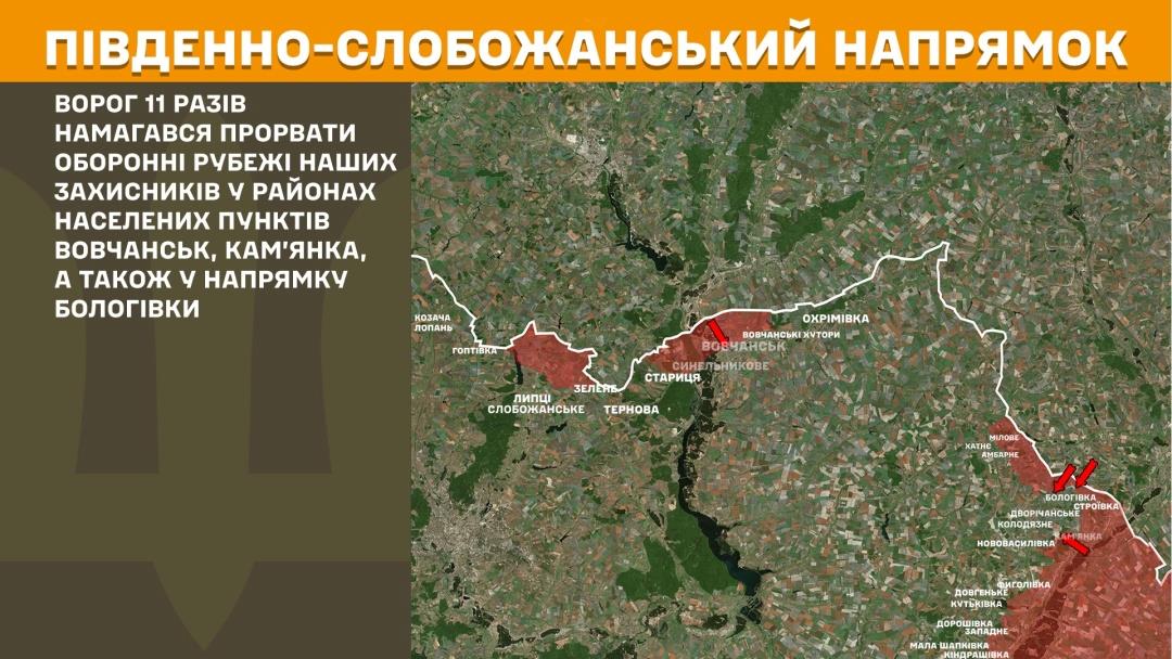 In the Southern Slobozhanshchyna sector, the Russian made 11 attempts to breach Ukrainian defenses near Vovchansk, Kamianka, and Bolohivka.