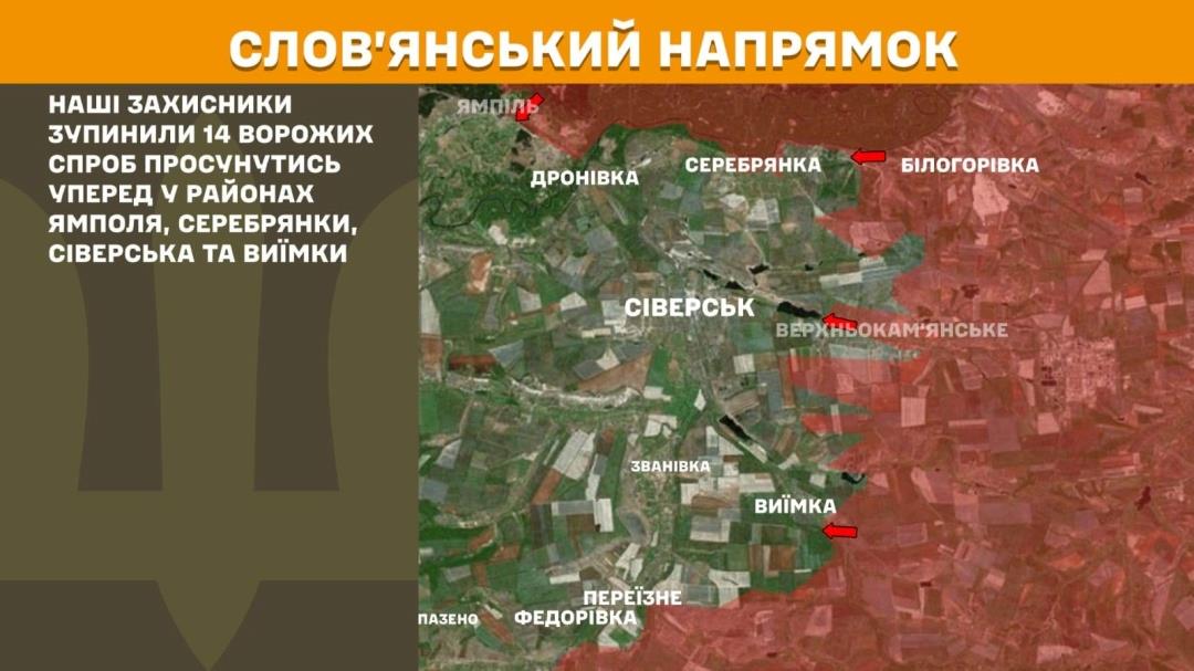 In the Sloviansk sector, Ukrainian defenders repelled 14 enemy attacks near Yampil, Serebrianka, Siversk, Vyimka.