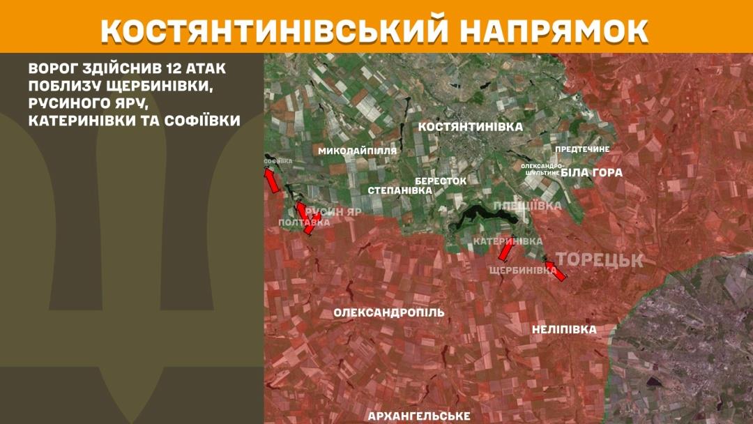 In the Kostiantynivka sector, 12 attacks occurred near Shcherbynivka, Rusyn Yar, Katerynivka, Sofiivka.