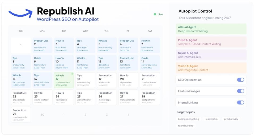 RepublishAI today announced the launch of its autonomous WordPress SEO platform that automates content creation from planning to publication. Unlike existing AI writing tools that require constant prompting and management, RepublishAI operates independently, using five specialized AI agents to research, write, optimize, generate images, and publish SEO content automatically.