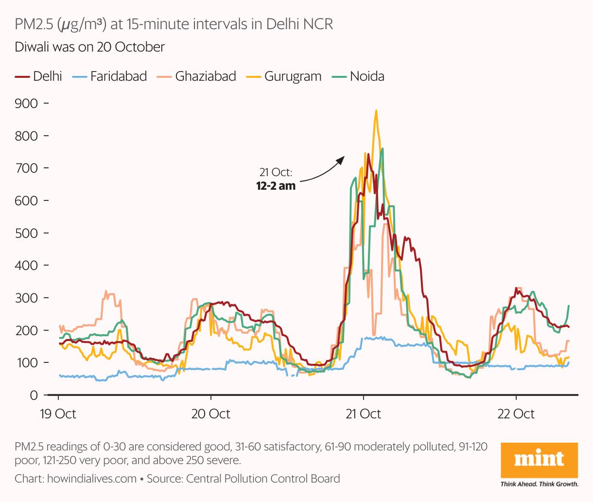 Immediately after the celebrations, AQI spiked seven-fold in the National Capital Region between 12-2 am, with Gurugram PM2.5 (μg/m3) reading reaching 877, followed by Noida at 760 and Delhi at 743, showed data from the Central Pollution Control Board (CPCB). Delhi's 24-hour average AQI on Diwali, 20 October, reached 345, marking the highest reading on Diwali since 2021's 382. This worsened further on 21 October at 351.