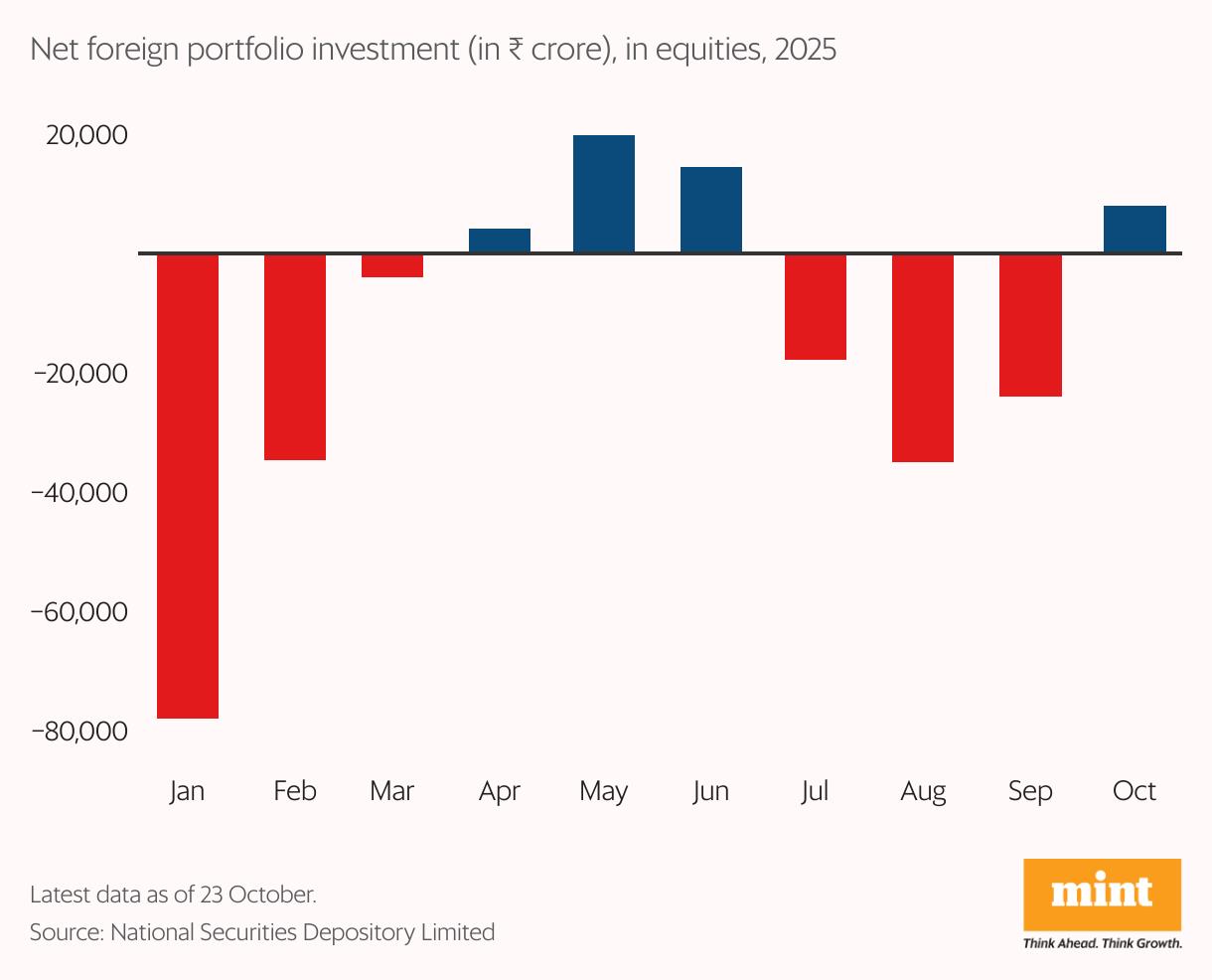 While this suggests the recent festivities and GST rate cuts lifted sentiments, 2025 has largely seen outflows, with six of the last 10 months seeing net selling. In 2025 so far, Indian equities have witnessed net selling of nearly ₹1.5 trillion.