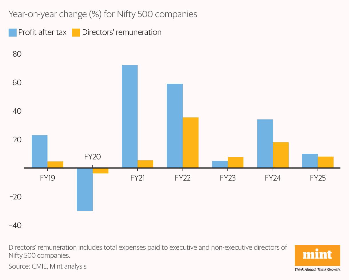 For those in the highest corporate echelons, substantial paycheques are not mere salaries but high-stakes incentive packages directly tied to performance. A Mint analysis of Nifty 500 companies confirms this correlation: in FY22, when profit after tax surged 59% year-on-year, directors' remuneration jumped 35.5%. Similarly, FY24's 34% profit growth translated to an 18.1% pay increase. However, this alignment works both ways.
