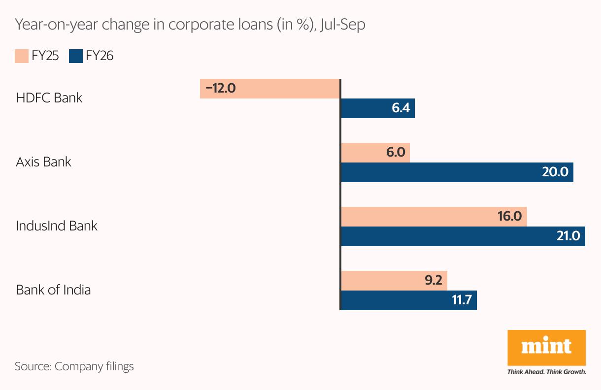 HDFC Bank, Axis Bank, IndusInd Bank, and Bank of India reported higher year-on-year growth in their corporate loan books in the second quarter. The corporate credit demand at banks came at a time when 10-year benchmark government bond yields rose 20 basis points (bps) to 6.5% in the September quarter as geopolitical uncertainties mounted.