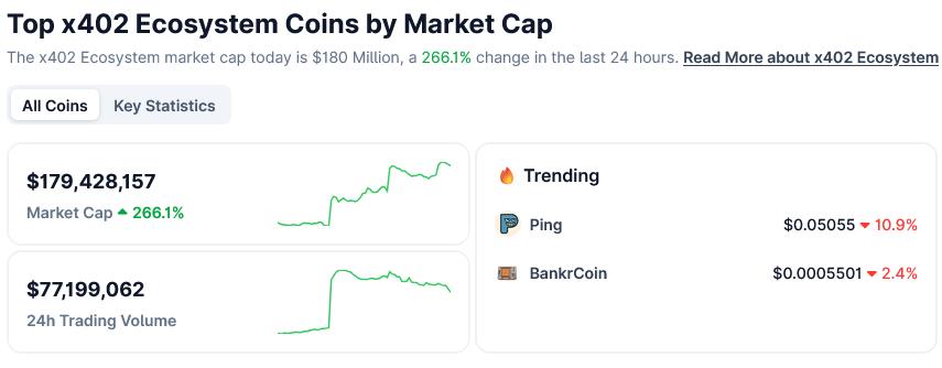 CoinGecko Now Tracks x402 Tokens as a New EcosystemDevelopers are leveraging the x402 protocol to launch tokens directly, igniting a wave of memecoin projects and new ecosystems. The surge in x402 token launches has prompted CoinGecko to list these tokens as a dedicated category, which now boasts a market capitalization approaching $180 million, with a 266% increase in the past 24 hours.
