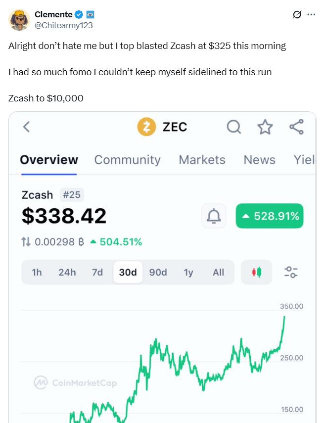 Similarly, crypto trader Clemente shared that their own decision to purchase Zcash was driven by intense FOMO, noting,“I couldn't keep myself sidelined to this run.” Their enthusiasm underscores how influential expert opinions and emotional market reactions continue to shape cryptocurrency price movements.