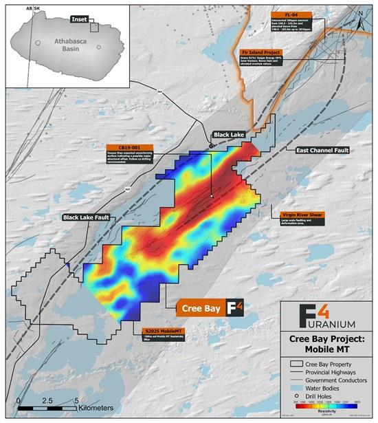 "The F4 technical team has established a proven and effective approach to uranium exploration in the Athabasca Basin, having been directly involved in four major uranium discoveries, including two within the past three years. Cree Bay is an exciting project, given its proximity to Orano and Geiger Energy's Fir Island property and prospective East Channel Fault, which the MT survey shows to continue onto the Cree Bay Property. Incorporating and merging the results from this survey with all previous data, the F4 team will apply its understanding of geophysical signatures and geological controls from previous uranium discoveries to define strong target areas at Cree Bay in the search for the next uranium deposit."