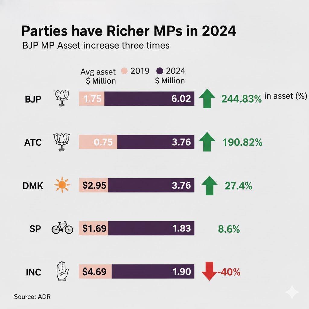 In 2024, winning BJP members reported an average wealth of nearly about $6 million compared with $2.8 million for Congress members.