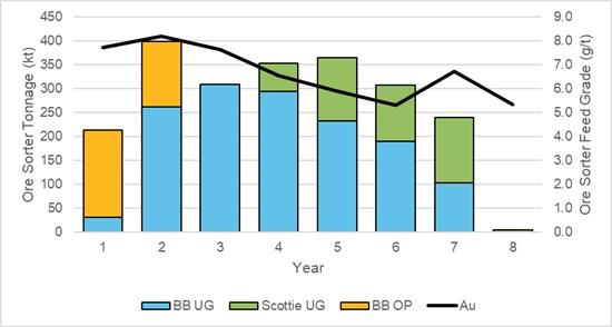 Note: BB UG = Blueberry underground, Scottie UG = Scottie underground, BB OP = Blueberry open pit, Au = gold grade (g/t), kt = thousand tonnes