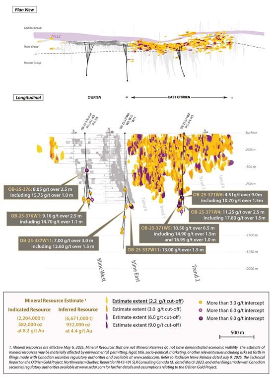 Today's results also include the first drill holes located below the western portion of the historic O'Brien Gold Mine, designated "O'Brien Mine West". As with the main mining area, no exploration had been conducted below O'Brien Mine West since operations ended in 1957. From pilot hole OB-25-376 and wedge branches W1 to W5, five holes returned intercepts with grades and thicknesses consistent with the Project's mineral resources, including OB-25-376W1, which intersected 9.16 g/t Au over 2.5 metres, including 14.70 g/t Au over 1.1 metres (Figure 1). This now extends gold mineralization at O'Brien Mine West 160 metres below the base of the former mine workings (Figure 4).