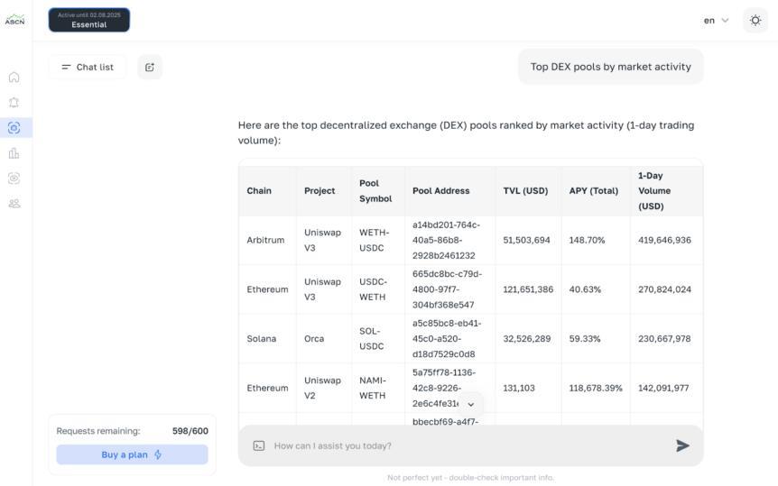 For instance, when asked“Top DEX pools by market activity,” ASCN instantly generates a detailed table and explains how to use the data to profit.