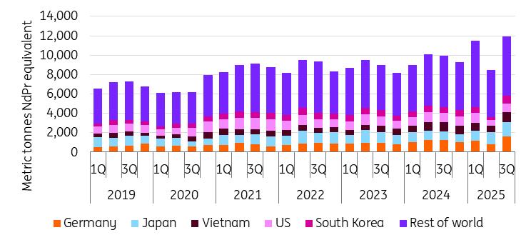 Note: Volume expressed as content of neodymium-praseodymium (NdPr) equivalent. China's supply figure for 2024 is adjusted to match production quotas and is not the total capacity available domestically in the country. Source: BNEF, ING Research How has Beijing used rare earths as a weapon in the trade war?