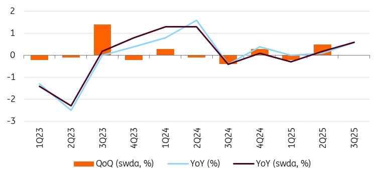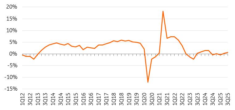 Compared to the expectations outlined at the end of last year, and even the forecasts made halfway through this year, performance in 2025 has been disappointing. Based on raw data, the first three quarters have shown little growth, with adjusted data showing a total year-on-year expansion of just 0.2%. A significant increase in economic activity in the final quarter would be required for GDP growth in 2025 to exceed that seen in 2024 (an average of 0.6%). However, there are currently no clear signs of this happening.