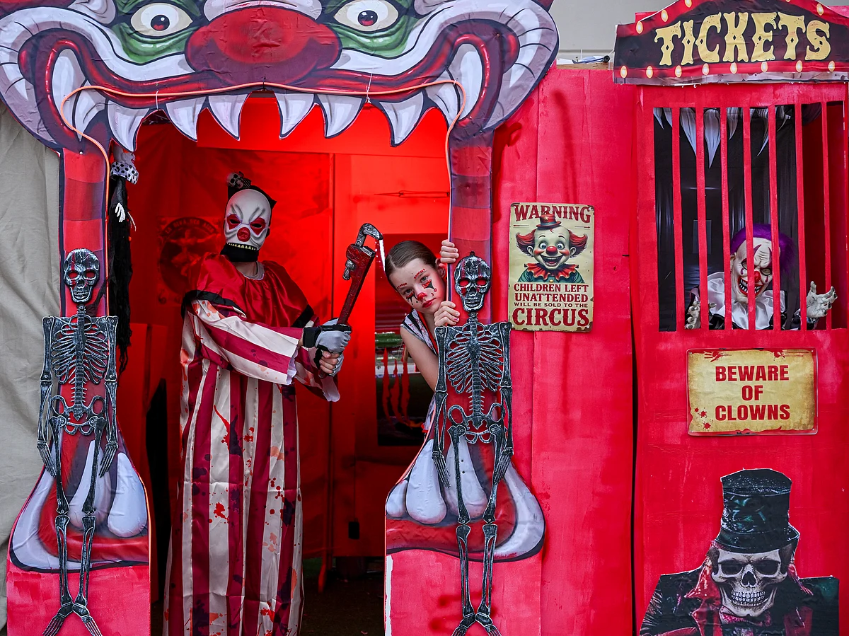 Walking through her carport, visitors enter through a giant clown's mouth, an idea inspired by her 14-year-old son, Matthew. Inside, there's a candy stand, a spinning wheel of knives, and even a 'Jumping Jack' figure crafted from leftover pieces of last year's Kraken prop.