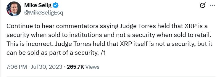 Industry analysts have pointed out Selig's focus on treating digital assets like commodities. His commentary on the SEC v. Ripple case in 2023 reflects this view; he argued XRP“is simply computer code” and comparable to other fungible commodities like gold and whiskey.