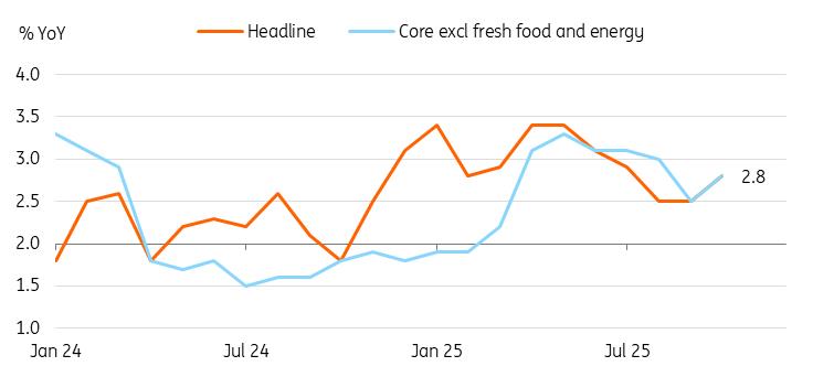 Tokyo CPI inflation increased 2.8% year-on-year in October (vs 2.5% in September, 2.4% market consensus). October is typically the month when companies adjust prices. A 0.6% month-on-month, seasonally adjusted, increase suggests businesses are raising final prices in response to input price hikes. Prices increased for both goods (0.9%) and services (0.4%), with notable gains in labour-intensive sectors like transport, communication, and entertainment.