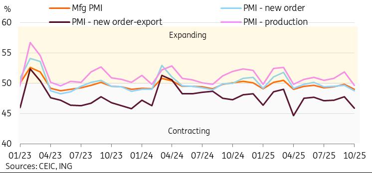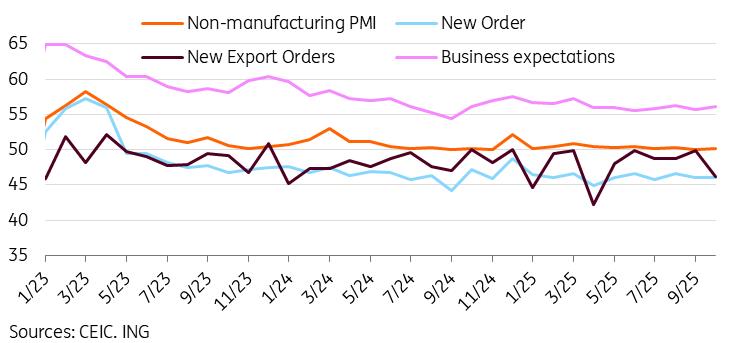 The downturn in the PMI marks a poor start to the fourth quarter and may cause some concern, given that growth has been supported by external demand and industrial activity. On a brighter note, the PMI has been in contractionary territory since April, but this has not translated into weakness in hard activity data. Come next month's PMI data, it will be interesting to see if the tariff reduction and extended trade truce with the US help support a recovery of new export orders.