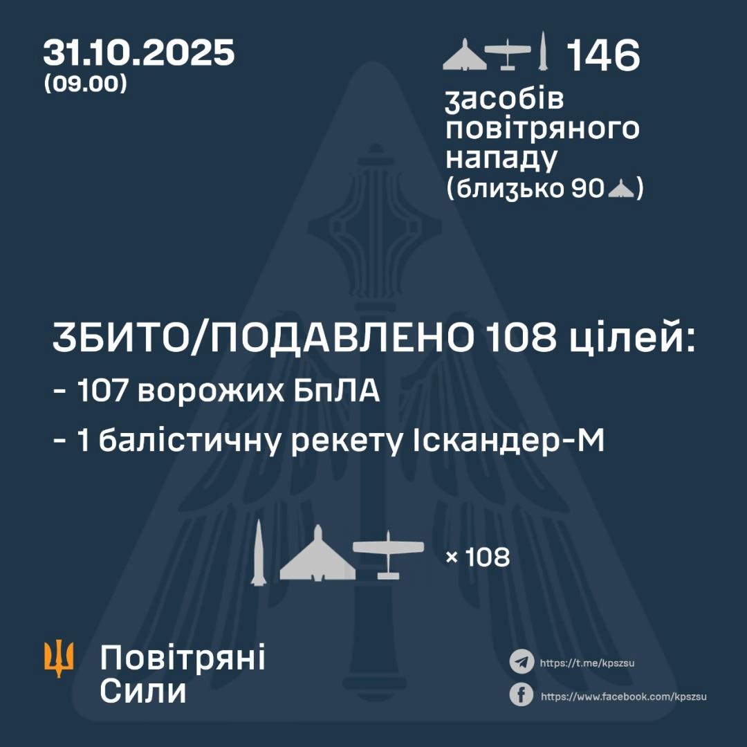 According to preliminary data, as of 9:00 a.m. on Friday, October 31, Air Defense Forces shot down/jammed one ballistic missile and 107 enemy Shahed, Gerbera, and other types of drones in the north, south, and east of the country.
