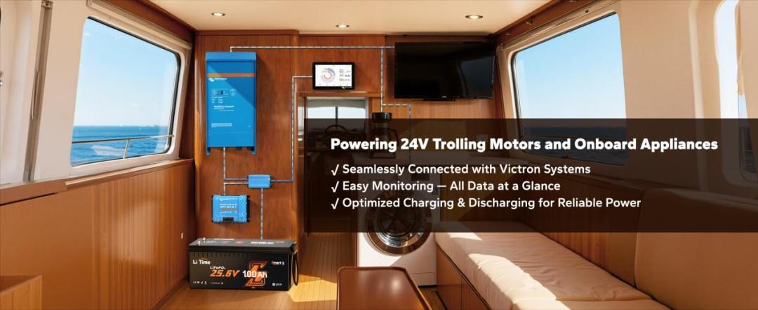 For RV and marine users, 12V remains the most familiar voltage platform. The LiTime 12V 100Ah Smart ComFlex battery, when integrated with Victron system, allows users to monitor battery performance in real time through the Victron Remote Management (VRM) system, display screen or mobile app - offering complete visibility into power flow and ensuring smooth operation of essentials like refrigerators, lighting, and entertainment devices.