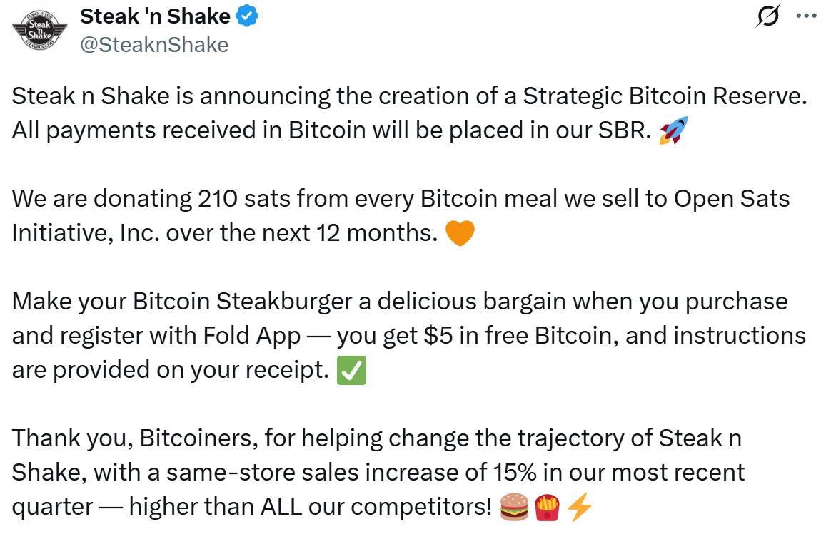 Source: FoldIn a recent announcement on X, Steak 'n Shake revealed that all payments received in Bitcoin will be allocated to its strategic Bitcoin reserve. The company also disclosed that for every Bitcoin meal sold, it will donate 210 satoshis - approximately $0.23 - to OpenSats, a nonprofit dedicated to supporting open-source Bitcoin development and contributors to Bitcoin Core.