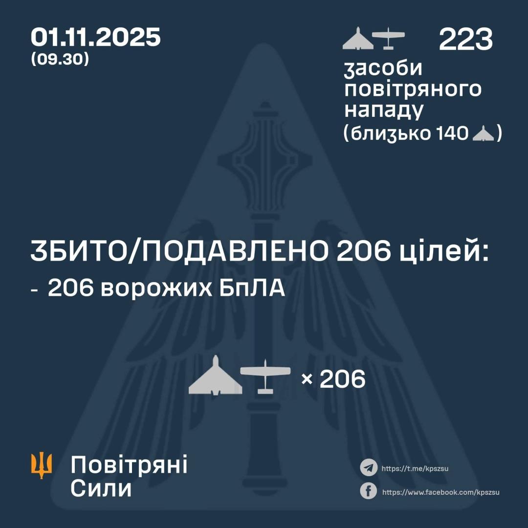 According to preliminary data, as of 9:30 a.m. on Saturday, November 1, Air Defense Forces shot down/neutralized 206 UAVs in the north, south, and east of Ukraine.