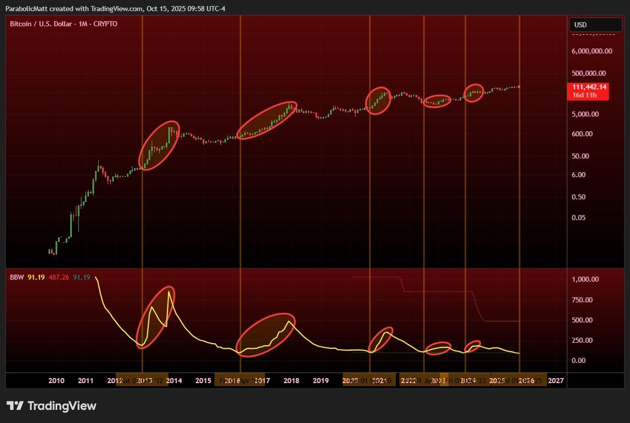 BTC/USD one-month chart with Bollinger Bands data. Source: Matthew Hyland/X