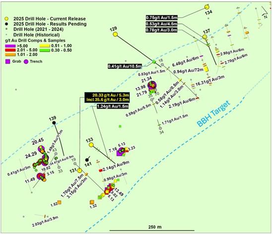 Hole 25ODD-131    20.33 g/t Au over 5.30m   Including 35.61 g/t Au over 3m