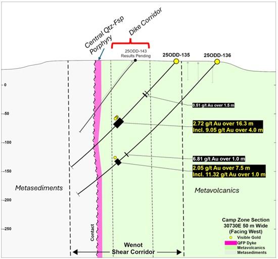 Most significant new results from the Camp Zone include 2.72 g/t Au over 16.3m in hole 25ODD-135 at a depth of -115m, 6.81 g/t Au over 1m and 2.05 g/t Au over 7.5m in hole 25ODD-136 at a depth of -180m, and 0.85 g/t Au over 12.70m in hole 25ODD-138, also above -200m depth. In all of these cases, the mineralization occurred within the felsic dikes, believed to be correlated to the preferentially mineralized "Dike Corridor" seen at the main Wenot deposit, and to previously drilled gold-bearing felsic dikes along strike in the Camp Zone.
