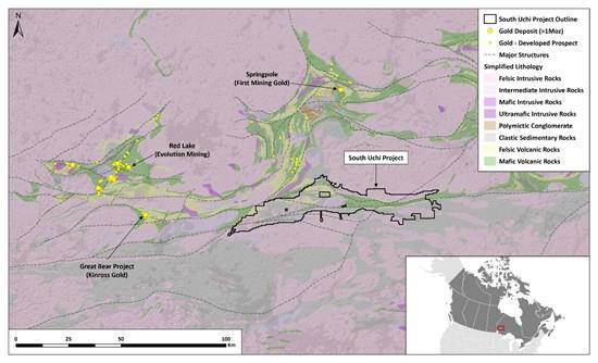 Figure 2. Regional geology with significant gold deposits and South Uchi Project location