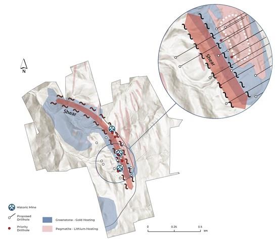 -    Drilling Underway: The program is designed to test multiple gold and lithium targets identified through historic drilling, surface sampling, and recent fieldwork. This marks the first modern drill testing of the Volney trend, a structurally controlled gold and LCT pegmatite system defined over a 1,000 m strike length (  Figures 1 and 2 ).