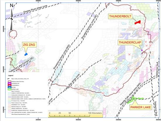 Map 2: Location of Thunderclap, Thunderbolt, Zig Zag and Parker Lake uranium mineral claims
