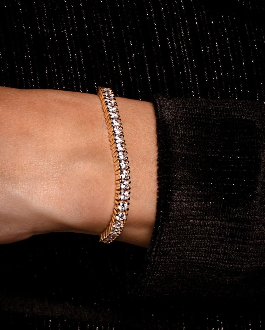 Close-up of a lab-grown tennis bracelet catching light on the wrist – understated luxury with lasting appeal.