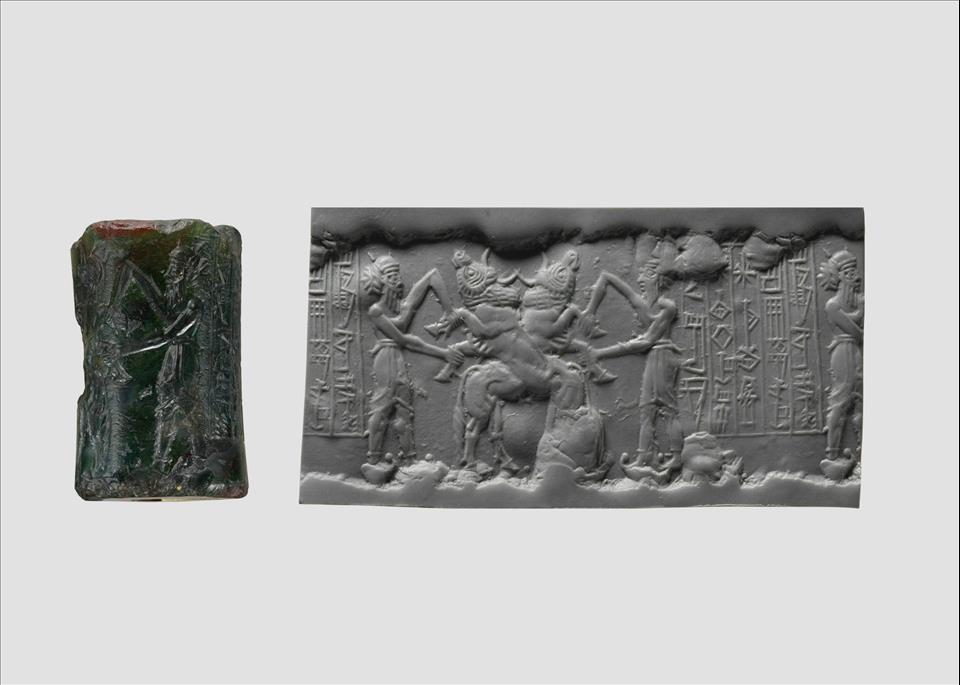 Akkadian cylinder seal made of serpentine, circa 2250-2150 B.C.E., depicting a bull-man wrestling a lion and a nude, bearded hero wrestling a water buffalo. The image on the right shows the impression the seal would make. Bequest of W. Gedney Beatty, 1941/Metropolitan Museum of Art