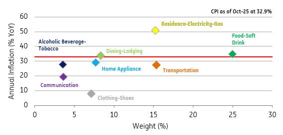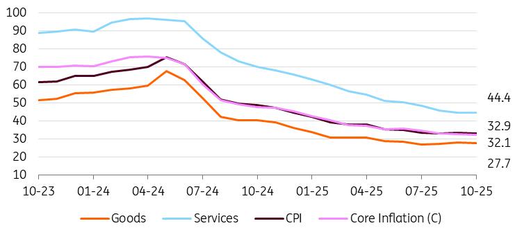 The food group made the largest contribution to monthly inflation (0.83ppt). The price increase in processed food has remained strong, exceeding the level seen in October 2024. However, unprocessed food turned out to be one of the factors driving lower-than-expected headline inflation; relatively benign fresh fruits and vegetables inflation proved significantly lower than it was in the same month of 2024. Annual food inflation stood at 34.9%, versus the CBT's assumption for this item at 26.5% for this year.