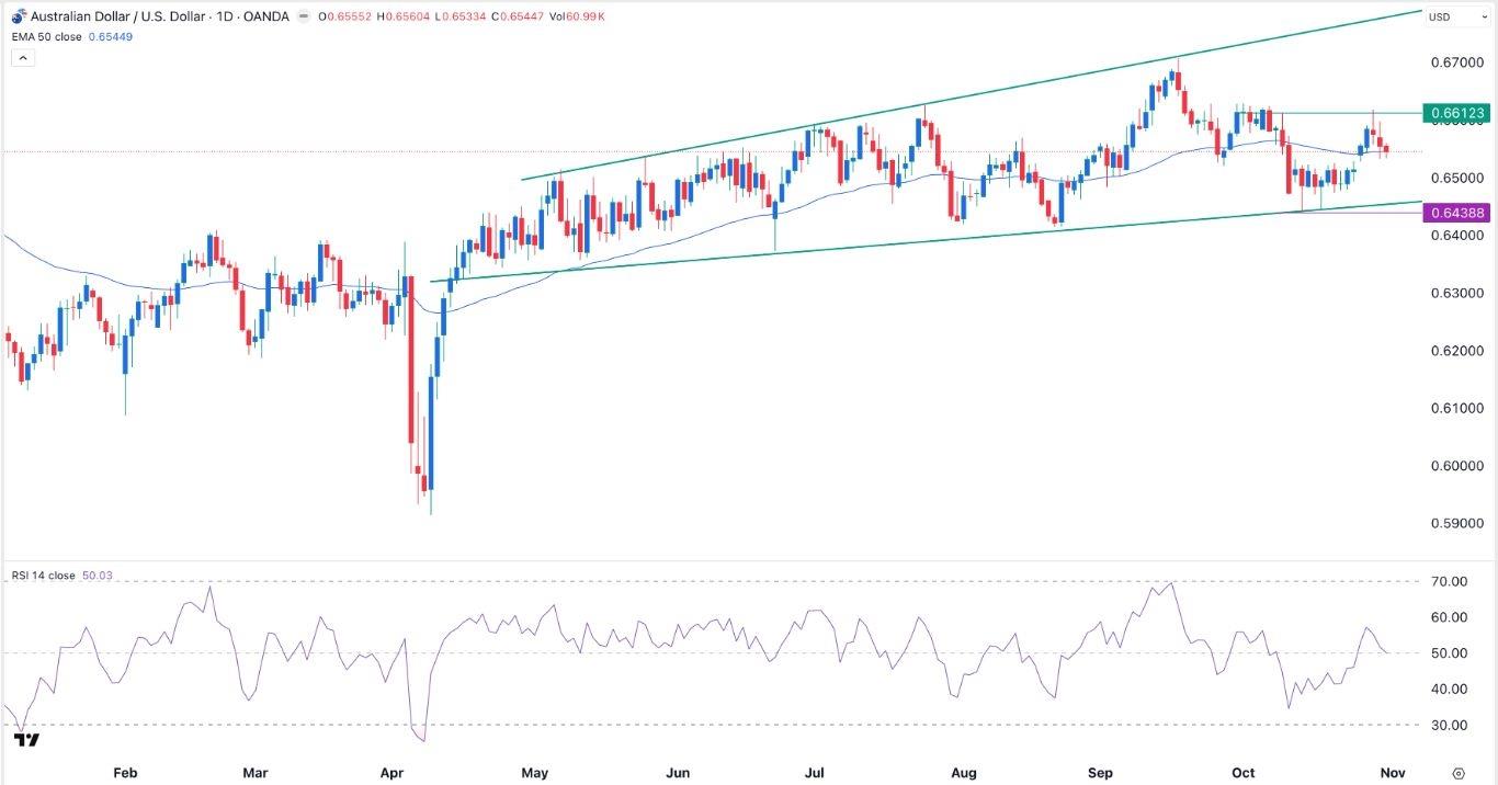 -   Buy the AUD/USD pair and set a take-profit at 0.6650.  Add a stop-loss at 0.6450.