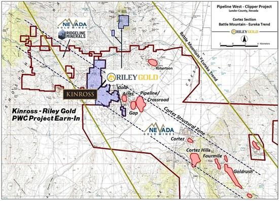 Riley Gold is an exploration and development company focused in Nevada, USA. Riley Gold's Pipeline West/Clipper Gold Project (" PWC ") is located in the Cortez mining district of the Battle Mountain - Eureka Trend. PWC is operated by Kinross Gold U.S.A., Inc. (" Kinross "), a wholly-owned subsidiary of Kinross Gold Corporation (TSX: K) (NYSE: KGC), under an exploration earn-in agreement executed in March 2024 whereby Kinross has the right to earn up to 75% of PWC by spending USD$20,000,000 (for full details of the Kinross agreement please see the March 14, 2024 news release). Kinross is funding and operating PWC and has a strategic 9.9% (on a partially diluted basis) equity interest in the Company acquired through a private placement.