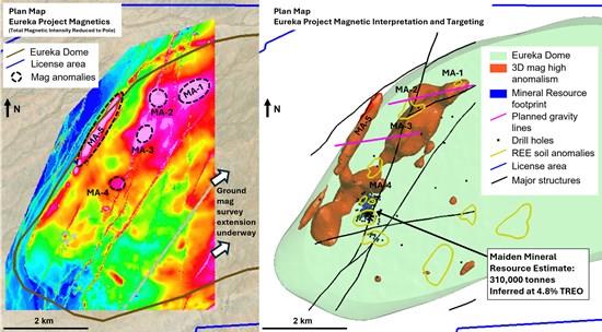 Multiple REE targets support strong discovery potential: These newly identified magnetic bodies add to the growing inventory of REE targets on the Project, including the large REE soil anomaly identified near the southern flank of the Eureka Dome, as reported in the Company's News Release dated October 1, 2025. Next steps underway: A gravity survey is planned to evaluate the size and density of the magnetic bodies ahead of drilling to test for further REE mineralization and resource expansion potential.