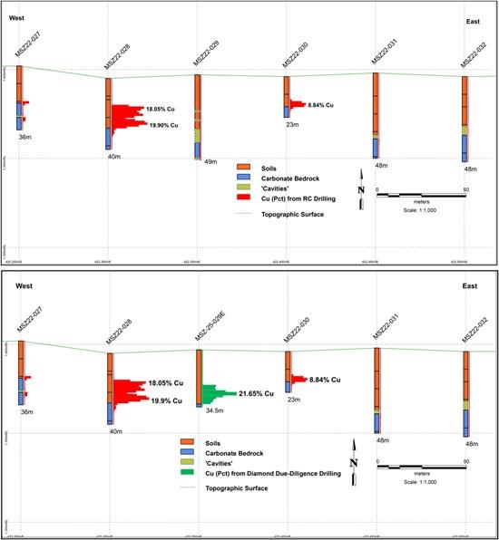 Note: Upper figure illustrates results from 2024 RC drilling with originally interpreted 'cavities': lower figure highlights the positive copper results along with verification that cavities are absent from 2025 diamond hole MSZ-25-DD-029.