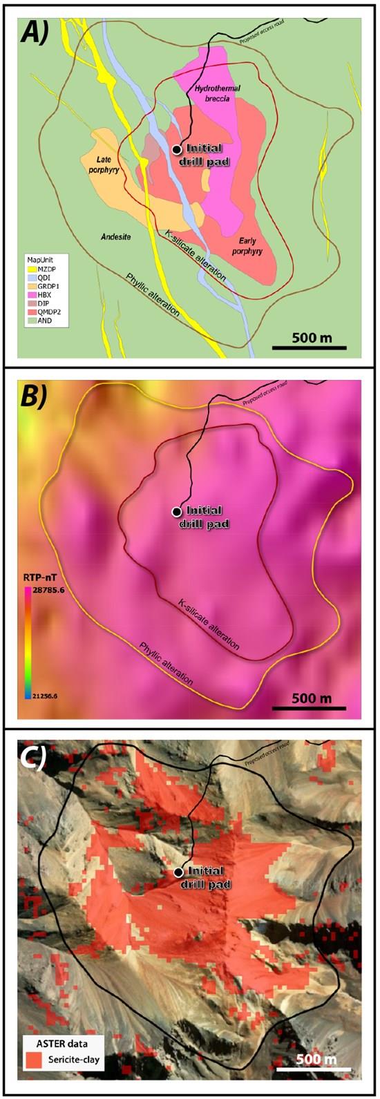 Figure 1. Plan maps of the El Perdido porphyry system. A) Geological map showing extents of potassic and phyllic alteration. B) 2025 Reduced to Pole magnetics. C) 2025 ASTER data showing phyllic-clay alteration.
