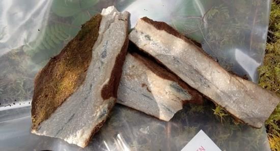 Figure 4: Field photograph of representative rock samples displaying fracture and foliation parallel stringer malachite, bornite and chalcopyrite mineralization hosted within dolomitized limestone along the Hughes Lake Trend, Humber Project (Location A on Figure 3).
