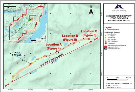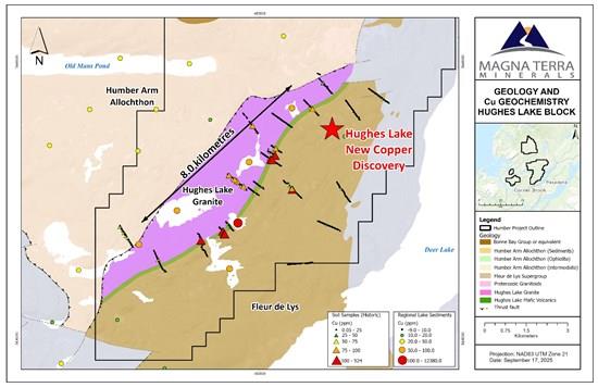 "The rapid growth of the surface strike extent of copper mineralization within the Hughes Lake Copper Zone so early into our exploration efforts, is a very exciting development for Magna Terra and its shareholders and certainly bodes well as we expand our systematic generative exploration efforts over the expansive project area. It is gratifying that we are able to expand the current zone of copper mineralization at Hughes Lake to a current strike length of 2.2 kilometres via traditional boot and hammer prospecting. We look forward to additional assay results from this work. In the interim, we continue to advance discovery of additional targets and zones of copper-cobalt-silver mineralization on the broader property package, particularly in areas of higher conductivity outlined in the recently completed airborne geophysical survey. While early stage, these initial generative results further support our view that the Humber Project has the potential to host Sediment-hosted Stratiform Copper deposits."