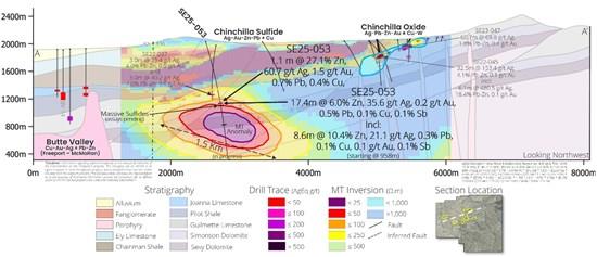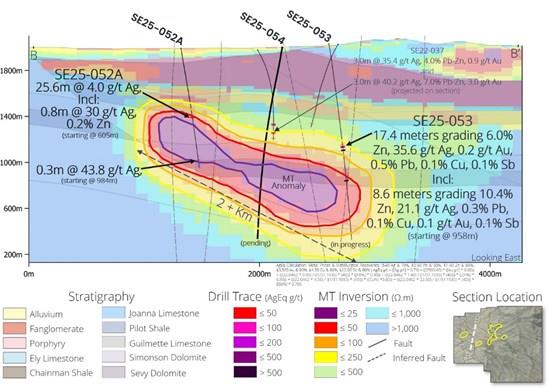 Figure 3: Simplified Chinchilla Sulfide X-Section B-B' looking east showing high-grade discovery hole SE25-053. SE25-052A did not adequately test the MT anomaly at a favourable orientation