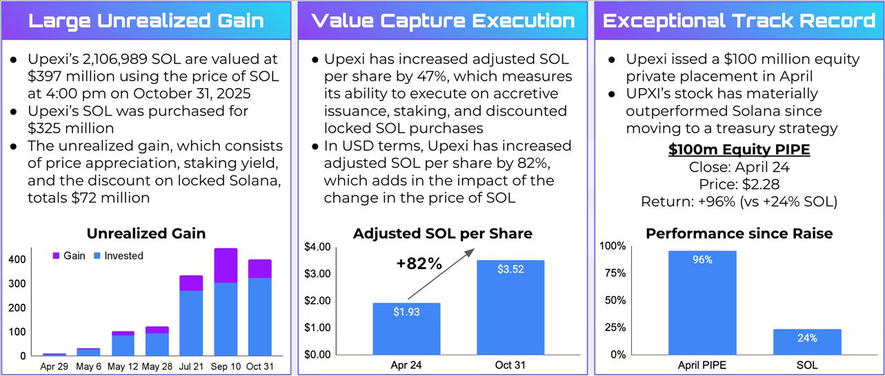 | Source: Company filings. Note: SOL count as of October 31. Treasury value calculated using price of SOL on October 31. Unrealized gain measured as of disclosure dates, with gain from SOL appreciation, staking income, and the discount. See press release dated September 11, 2025 for calculation and disclosures on adjusted SOL per share. Raise returns based on UPXI price as of October 31. SOL performance is from the date of the raise close until 4:00pm EST on October 31 for comparability. |