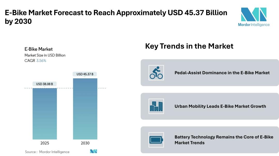 The e-bike market is making a marked transition from niche to mainstream mobility solution, and is projected to reach around USD 45.37 billion by 2030. According to the recent market analysis by Mordor Intelligence, the e-bike market size stood at USD 38.08 billion in 2025 and is expected to expand at a compound annual growth rate of approximately 3.56 % during the forecast period.